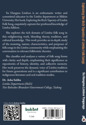 Su Hangma Limboo is an enthusiastic writer and committed educator in the Limbu department at Sikkim University. Her book, Exploring the Rich Tapestry of Limbu Folk Song, exquisitely captures her profound knowledge of Limbu folklore. She explores the rich domain of Limbu folk song in this enlightening work, blending theory, tradition, and cultural knowledge. This work provides an in-depth study of the meaning, nature, characteristics, and purposes of folk songs in the Limbu community while emphasizing the conversation in relevant folkloristic theories. She classifies and analyses a variety of folk song forms with clarity and depth, emphasizing their significance as repositories of history, identity, and collective memory. Her work preserves the dynamic voice of Limbu tradition for future generations and is a significant contribution to indigenous literature and oral tradition studies. Dr. Asha Subba Limbu Department (HoD) Nar Bahadur Bhandari Government College, Tadong